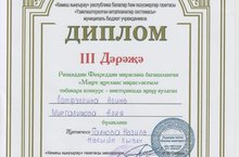 "Көмеш кыңгырау" республика балалар Һәм яшүсмерләр газетасы "Үзекләштергән китапханәләр системасы" муниципаль бюджет учреждениясе үткәргән Ризаэддин Фәхреддин мирасына багышланган " Мәңге җуелмас мирас" төбәкара конкурс-викторинада безнең мәктәп укучылары Лотфуллина Алинә 7в һәм Миргалимова Алия 7б мактаулы III урын яулап алдылар. Җиңү белән котлыйбыз, яңа уңышлар телибез!!!