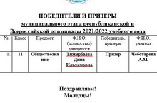 Победители и призеры муниципального этапа олимпиады по обществознанию 08.12.2021