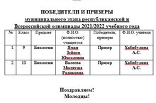Победители и призеры муниципального этапа олимпиады по биологии 08.12.2021