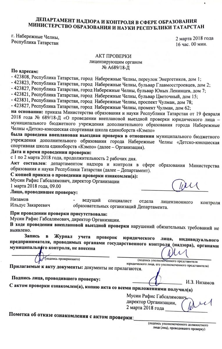 Акт проверки лицензирующим органом № А689/18-Д от 02.03.2018 г.