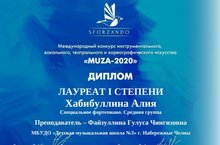 Поздравляем Хабибуллину Алию и ее преподавателя Файзуллину Гулусу Чингизовну с победой на Международном конкурсе инструментального, вокального, театрального и хореографического искусства "MUZA-2020". Молодцы!