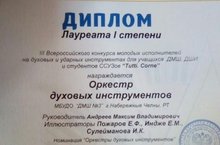 Поздравляем духовой оркестр ДМШ №3 и его руководителя Андреева Максима Владимировича с достойной победой на III Всероссийском конкурсе молодых исполнителей на духовых и ударных инструментах для учащихся ДМШ, ДШИ и студентов ССУЗов "Tutti.Corne". Наш оркестр стал лауреатом I степени. Молодцы!
