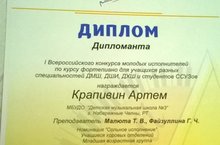 Поздравляем Крапивина Артема (преп. Малюта Т.В., Файзуллина Г.Ч.), который стал дипломантом на I Всероссийском конкурсе молодых исполнителей по курсу фортепиано для учащихся разных специальностей ДМШ, ДШИ, ДХШ и студентов ССУЗов. Желаем дальнейших успехов!!!