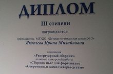 Поздравляем преподавателя по классу фортепиано Яковлеву Ирину Михайловну с Дипломом III степени Открытого Республиканского конкурса методических работ педагогов дополнительного образования и учителей образовательных организаций.