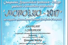 Поздравляем учащуюся нашей школы юную пианистку Цапкову Марию (класс преподавателя Малюта М.П.) с Победой на Открытом Всероссийском фестивале-конкурсе детского и юношеского творчества "Морозко" (26.02.17, г. Казань)