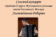 9 марта в 18.00 в Малом концертном зале школы состоится сольный концерт студента II курса Музыкального училища имени Гнесиных Алеветдинова Роберта! Добро пожаловать!