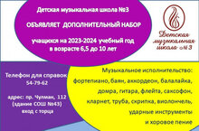 ПРИХОДИТЕ К НАМ УЧИТЬСЯ! 19.06.2023 Детская музыкальная школа № 3 объявляет дополнительный набор учащихся на новый 2023-2024 учебный год. тел. учебной части - (8552) 54-79-62 Приемные испытания: 31 августа с 17.00 до 19.00 Ждём Вас и Ваших детей по адресу: 48/14, СОШ №43 (вход с торца)