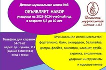 ПРИХОДИТЕ К НАМ УЧИТЬСЯ! 07.04.2023 Детская музыкальная школа № 3 объявляет набор учащихся на новый 2023-2024 учебный год. тел. учебной части - (8552) 54-79-62 Прием заявлений: с 24 апреля по 31 мая Консультации для поступающих: 29,30 мая с 18.00 Приемные испытания: 31 мая с 17.00 до 19.00 Ждём Вас и Ваших детей по адресу: 48/14, СОШ №43 (вход с торца) Приказ 042 об организизации приема детей на 23-24 у_г.