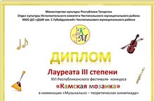 Поздравляем воспитанников и преподавателей ДМШ N°3, принявших участие в Республиканском фестивале-конкурсе "Камская мозаика" в г.Чистополь.