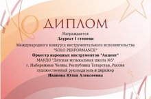 Подведены итоги IV МЕЖДУНАРОДНОГО КОНКУРСА ИНСТРУМЕНТАЛЬНОГО ИСПОЛНИТЕЛЬСТВА «SOLO PERFORMANCE». Более 200 заявок из России, Казахстана и Республики Беларусь, среди которых как солисты исполнители: учащиеся муз.школ, студенты колледжей, ссмш(колледж), так и творческие коллективы: ансамбли и оркестры. Оценивало выступления конкурсантов компетентное жюри в составе профессора КГК им.Н.Жиганова Смирновой А.Н, преподавателя РАМ им.Гнесиных, худ.руководителя и главного дирижёра Молодежного симфонического оркестра Сухарникова Ф.П. и директора Набережночелнинского колледжа искусств Спирчиной Т.В.