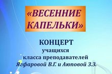 «Весенние капельки». Концерт учащихся класса преподавателей В.Г. Ягфаровой и 3.3. Аюповой. 20 апреля в 17:00. Большой зал ДМШ №6 им. С. Сайдашева.