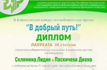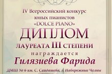 Всероссийский конкурс юных пианистов "Dolce piano", г.Уфа, 21-23 декабря 2020 г. Гилязиева Фарида - лауреат 3 степени. Преподаватель - Бондарь Юлия Анатольевна.