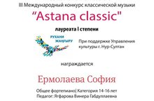 Поздравляем Ермолаеву Софию (класс преподавателя Ягфаровой В.Г.) с победой в III Международном конкурсе классической музыки "Astana classic", посвященном 180- летию П.И.Чайковского!