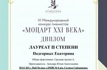 III международный конкурс пианистов "Моцарт XXI века", г.Казань, 21.11.2020 г. Подгорных Екатерина - ЛАУРЕАТ II степени. Преподаватель - Бондарь Юлия Анатольевна
