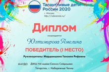 Всероссийский конкурс "Талантливые дети России", г. Москва, 17.12.2020 г. Юлтимирова Амелина - I место. Преподаватель - Мардамшина Танзиля Рифовна