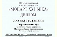 Лауреатом 1 степени III Международного конкурса пианистов "Моцарт XXI века" (г.Казань, 21.11.2020г.) стал наш фортепианный дуэт: Склямина Лидия Сергеевна и Паскичева Диана Станиславовна