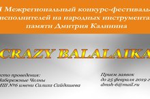 3 марта 2019 г. в ДМШ №6 имени Салиха Сайдашева состоится I МЕЖРЕГИОНАЛЬНЫЙ КОНКУРС-ФЕСТИВАЛЬ ИСПОЛНИТЕЛЕЙ НА НАРОДНЫХ ИНСТРУМЕНТАХ ПАМЯТИ ДМИТРИЯ КАЛИНИНА "CRAZY BALALAIKA"