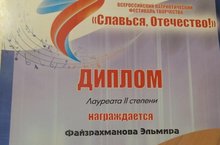 Учащаяся нашей школы Файзрахманова Эльмира (класс преподавателя Уразаевой Ляйсан Камиловны) стала Лауреатом 2 степени Всероссийского патриотического фестиваля "Славься, Отечество"!!! ПОЗДРАВЛЯЕМ!!
