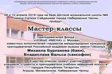 9, 10 апреля 2018 года на базе Детской музыкальной школы №6 имени Салиха Сайдашева города Набережные Челны пройдут мастер–классы преподавателей фонда «НОВЫЕ ИМЕНА» (г. Москва) известных исполнителей, лауреатов международных конкурсов, преподавателей Российской академии музыки имени Гнесиных: Михаила Бурлакова (баян) и Владислава Вальса (саксофон). В мастер-классах примут участие учащиеся, студенты и преподаватели учебных заведений искусств городов Республики Татарстан: Агрыза, Мензелинска, Набережные Челны.