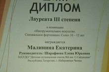 ПОЗДРАВЛЯЕМ МАЛИНИНУ ЕКАТЕРИНУ - Лауреата 3 степени Международного конкурса "Арт-Олимп" г.Елабуга, 26.11.2017 г. (кл.преп. Е.Ю.Шарафиевой).