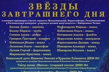 24 мая прошёл долгожданный ежегодный концерт проекта «Звёзды завтрашнего дня». В концерте приняли участие: вокальный ансамбль «Рассвет» ДМШ №6, худ. рук. Заслуженный работник культуры РТ О.И.Cизова; Язгулем Шакирова, преп. Л.К.Уразаева; Кирилл Вылку, преп. Р.А.Денислямов; Алина Нуруллина, преп. Е.В.Лобанова