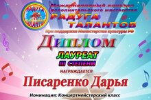 Писаренко Дарья - лауреат Международного конкурса исполнительского мастерства "Радуга талантов" при поддержке Министерства культуры РФ.