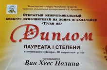 Ван Хеес Полина - лауреат Открытого межрегионального конкурса исполнителей на домре и балалайке "Туган як"!