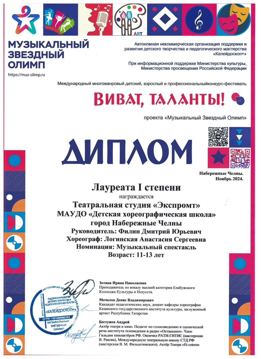 Театральная студия "Экспромт" и преподаватель актёрского мастерства Филин Дмитрий Юрьевич приняли участие в Международном многожанровом детском, взрослом и профессиональном конкурсе-фестивале "Виват, Таланты!" проекта "Музыкальный Звёздный Олимп " стали обладателями Диплома лауреата 1 степени в номинации "Музыкальный спектакль" . Так держать!