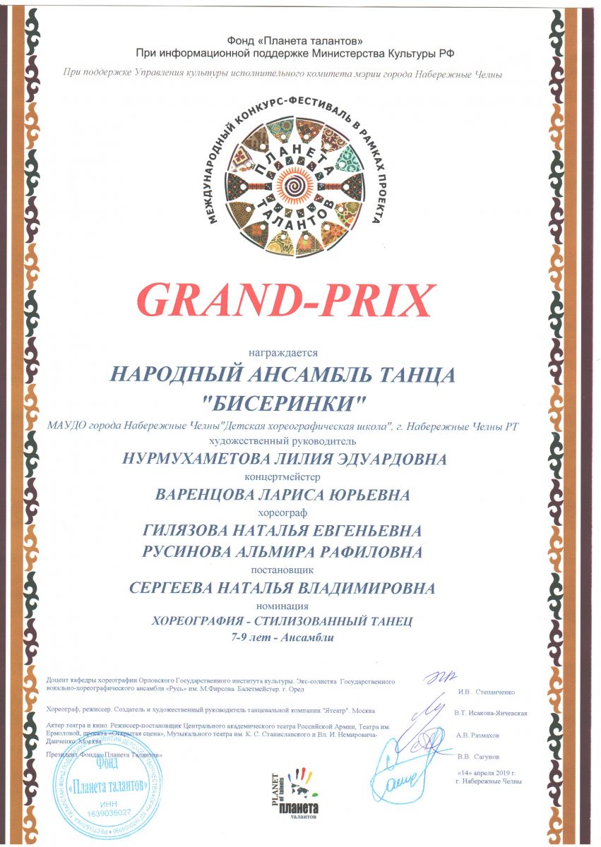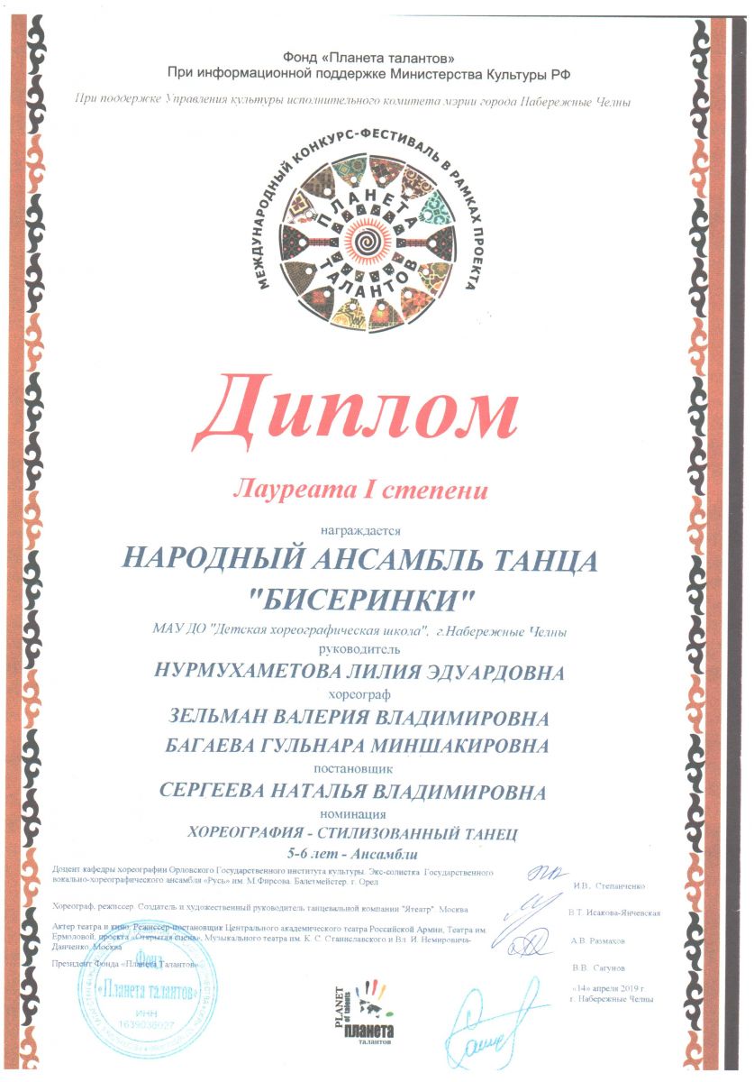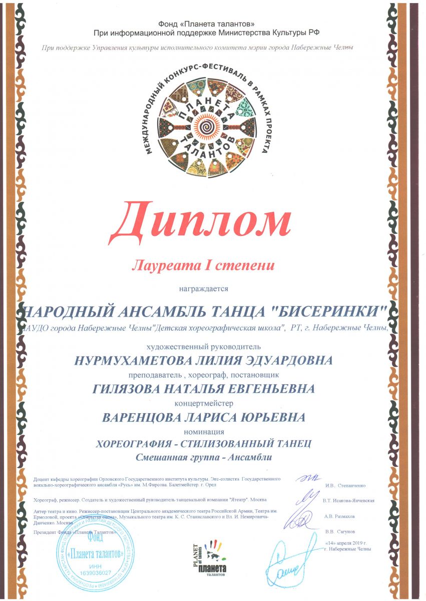 13 апреля 2019 года прошёл Международный конкурс-фестиваль в рамках проекта «Планета Талантов». В нём приняли участие младших и средних классов ансамбля Бисеринки. Итогом стала высшая награда ГРАН ПРИ, два диплома Лауреата I степени и диплом Лауреата II степени: классы преподавателей Русиновой А.Р., Гилязовой Н.Е., Зельман В.В. и Багаевой Г.М.