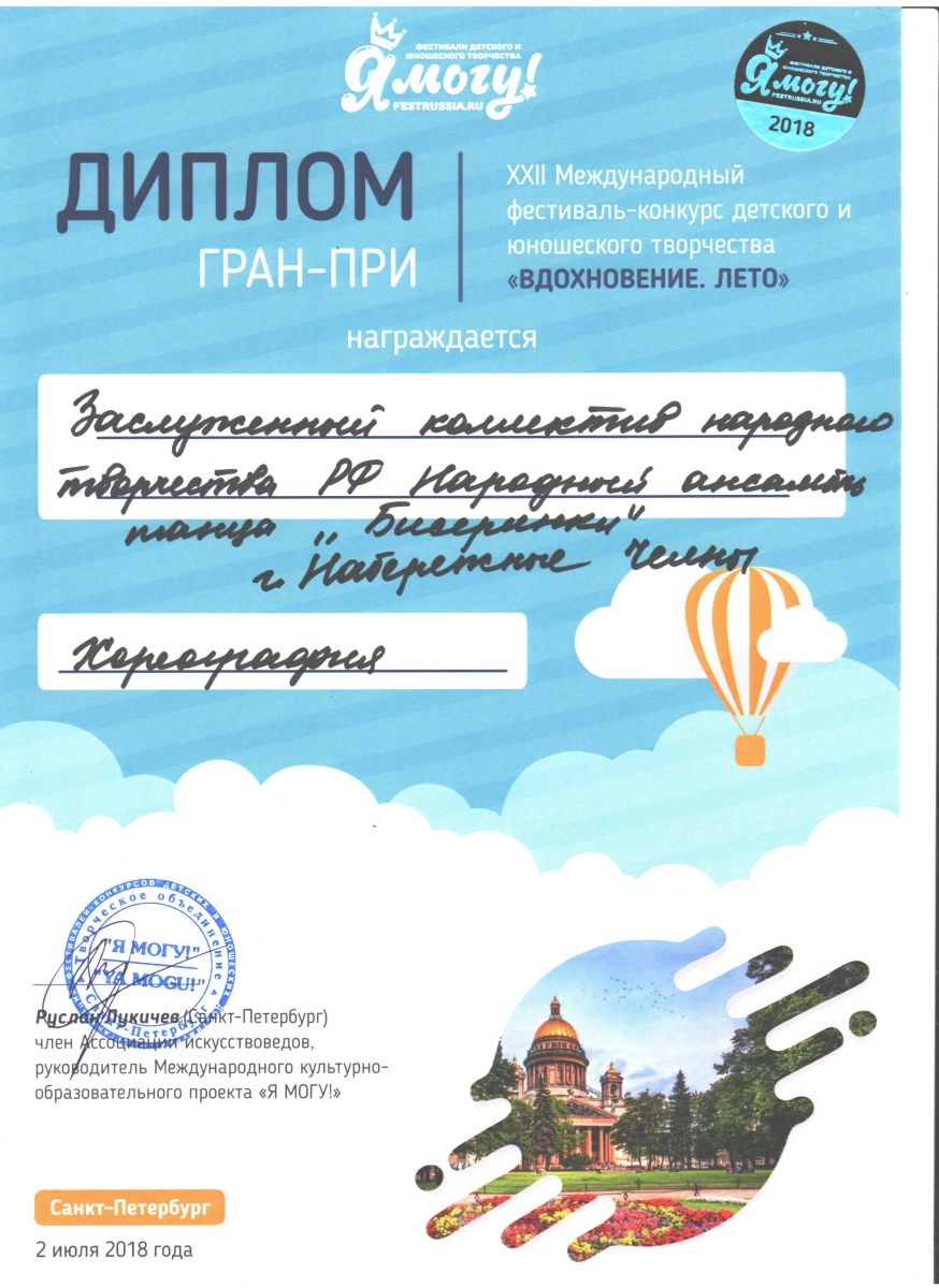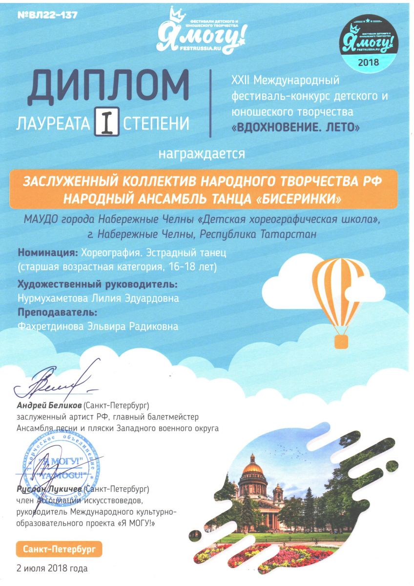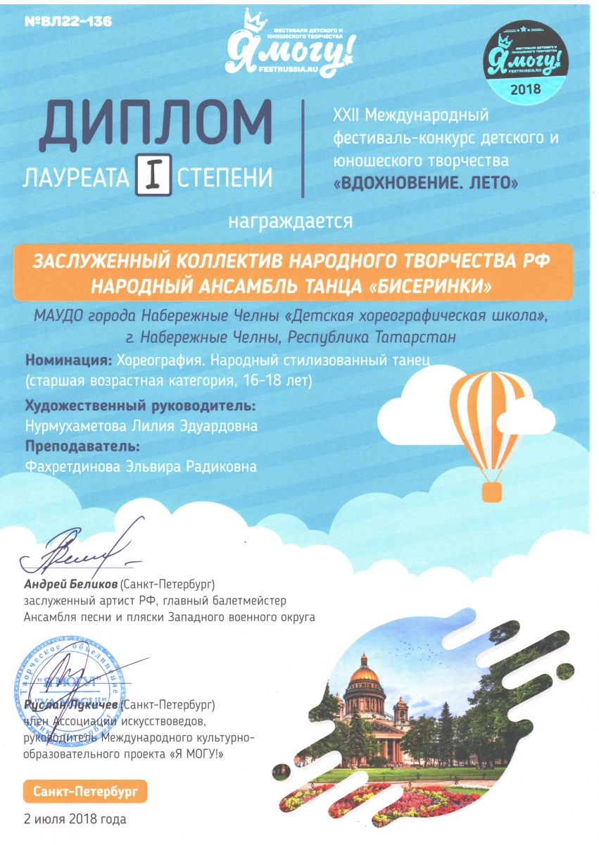 Результаты участия в XXII Международном фестивале-конкурсе детского и юношеского творчества "Вдохновение. Лето" 06.08.2018