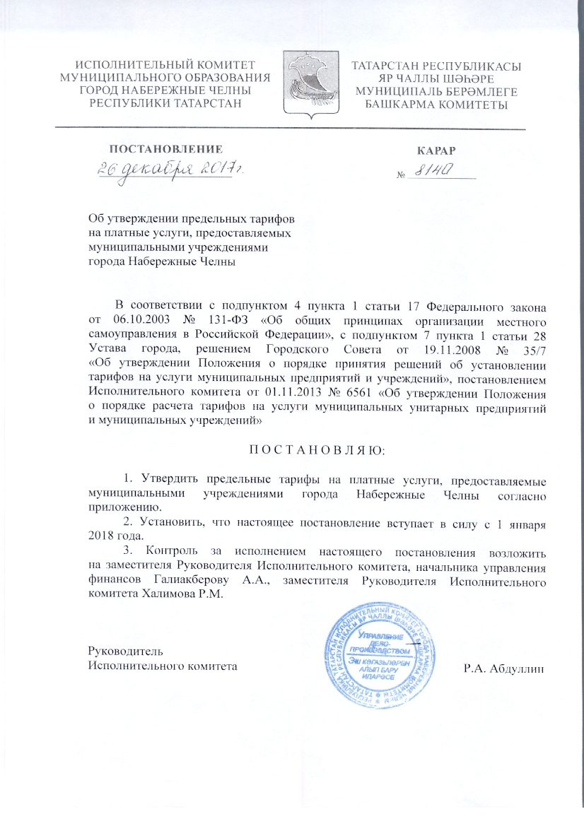 Постановление РИКа от 26.12.2017 г. № 8140 "Об утверждении предельных тарифов на платные услуги"