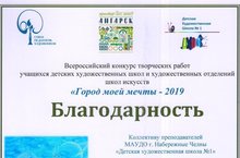 Обучающиеся Детской художественной школы №1 Бирюкова Ксения (преподаватель Муратова Эльвира Салимовна) получила диплом третьей степени во Всероссийском конкурсе творческих работ учащихся детских художественных школ и художественных отделений школ искусств «Город моей мечты - 2019». Обучающиеся Кабирова Камиля (преподаватель Шайдуллина Диляра Николаевна), Золотова Диана и Рязанова Полина (преподаватель Мустафина-Хазиева Лилия Фаясовна) стали лауреатами конкурса.