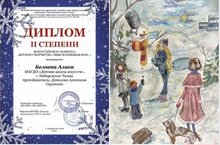 Беляева Алиса, Закирова Эмилия, Сабирова Чулпан и Титова Элина - учащиеся художественного отделения (преподаватель Алевтина Сергеевна Данилова) приняли участие во Всероссийском конкурсе детского творчества «Зима волшебная моя…» и стали обладателями дипломов II степени!
