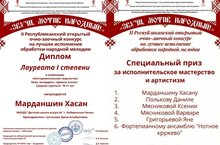 Учащийся музыкального отделения (народные инструменты) нашей школы Марданшин Хасан, класс преподавателя Султановой Луизы Альбертовны, стал Лауреатом I степени
