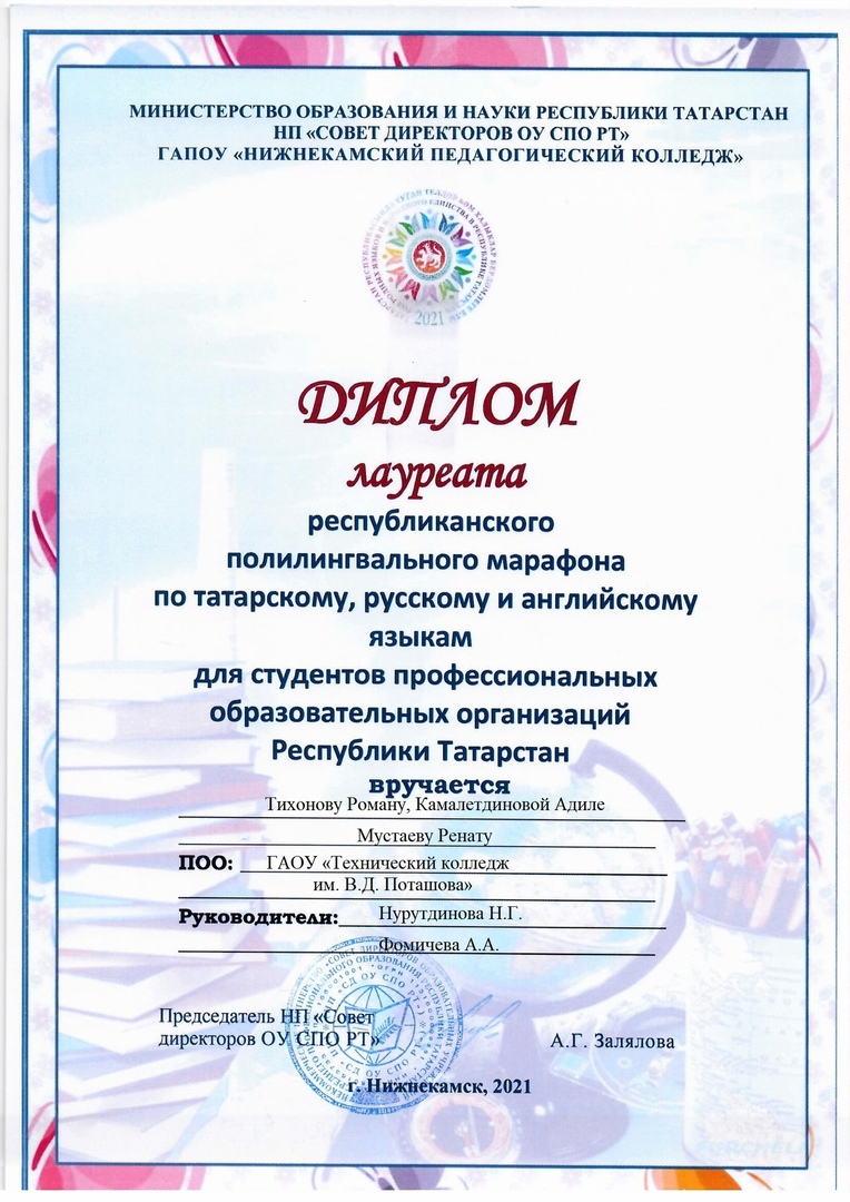 Полилингвальный марафон проводился в 2 тура: 1 тур – заочный. В первом туре марафона приняли участие команды обучающихся из 28 профессиональных образовательных организаций Республики Татарстан. В команду Технического колледжа вошли студенты второго курса: Камалетдинова Адиля (ОП-9-11), Мустаев Ренат (ОП-9-11) и Тихонов Роман (ИС-9-6). Руководители - преподаватели английского языка Нурутдинова Н.Р. и Фомичева А.А.