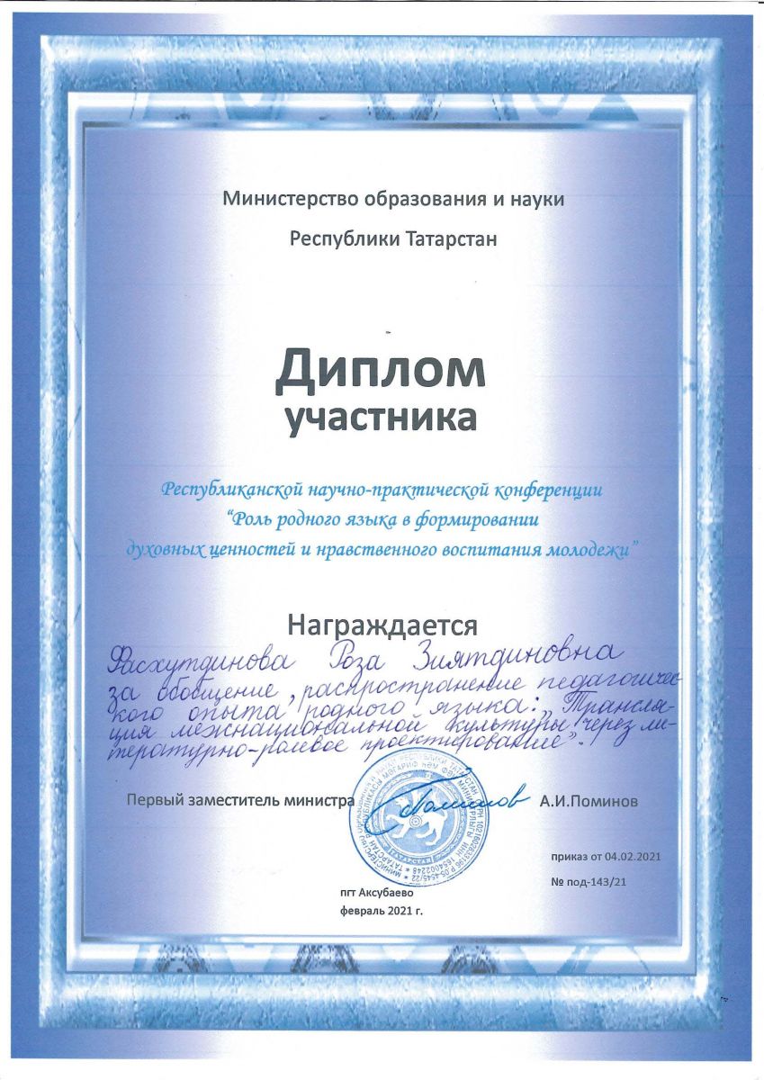 - Фасхутдинова Роза Зиятдиновна («Трансляция межнациональной культуры через литературно-ролевое проектирование.»);