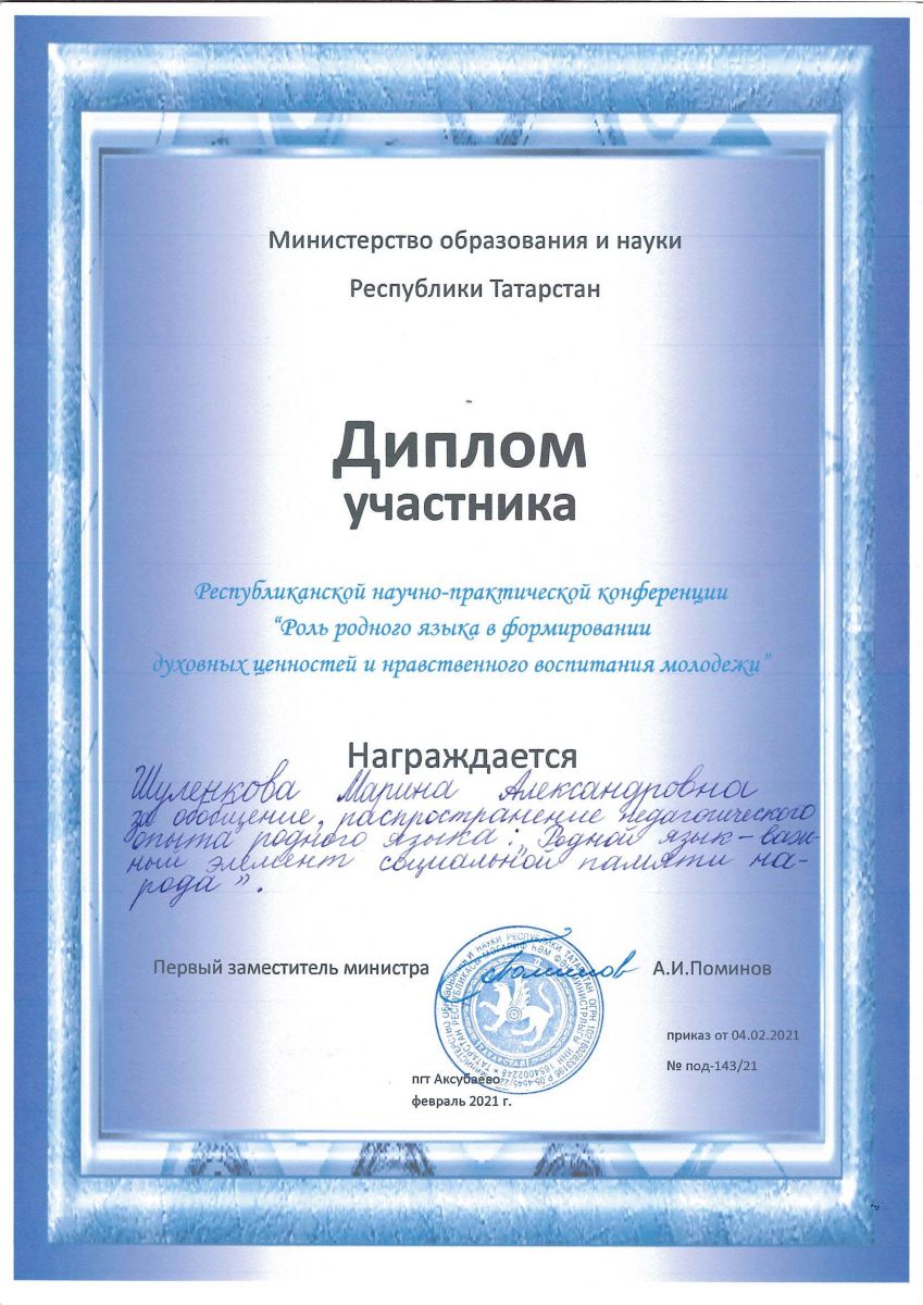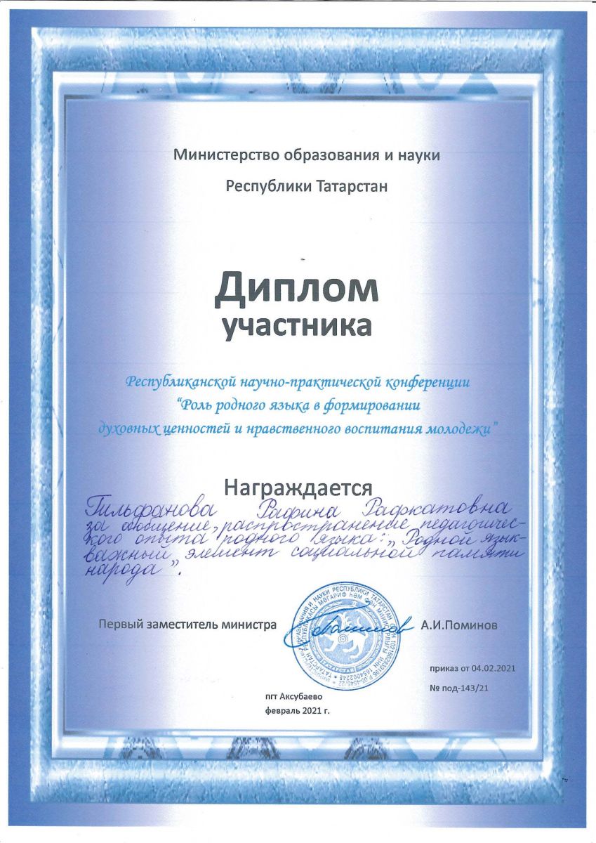 Опубликовано: 05.03.202119.02.21 г. на базе ГАПОУ «Аксубаевский техникум универсальных технологий» прошла Республиканская научно-практическая конференция («Роль родного языка в формировании духовных ценностей и нравственного воспитания молодёжи»), в которой приняли участие преподаватели нашего техникума: