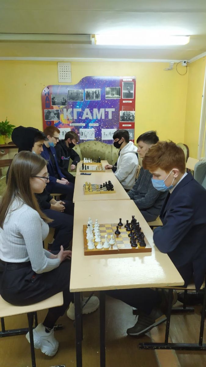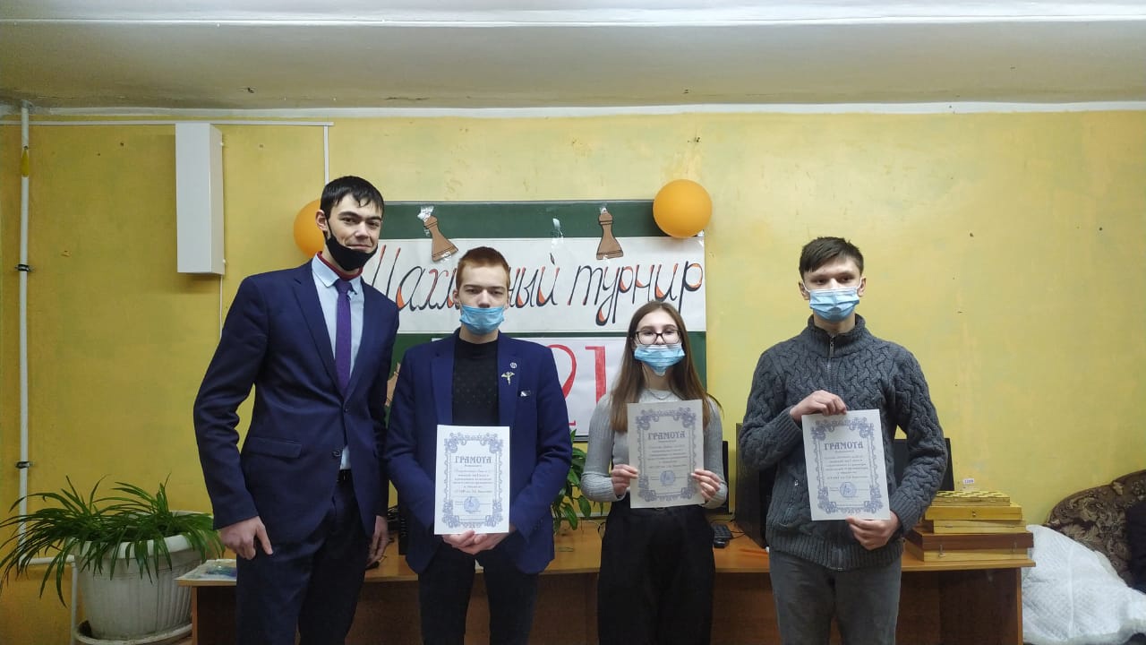 Опубликовано: 18.03.2021В феврале прошел V традиционный шахматный турнир среди студентов, проживающих в общежитии. Победителем турнира второй год подряд стала Копылова Алена - студентка группы 236 К. Второе место занял Фаизрахманов Ренат – группа 205 Тэ, третье место Кононов Станислав – группа 102 М.