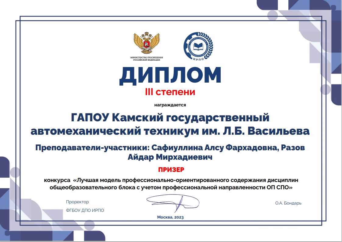 Опубликовано: 29.12.2023Поздравляем Сафиуллину Алсу Фархадовну и Разова Айдара Мирхадиевича с победой в конкурсе лучшей модели профессионально ориентированного содержания дисциплин общеобразовательного блока с учетом профессиональной направленности образовательной программы среднего профессионального образования!