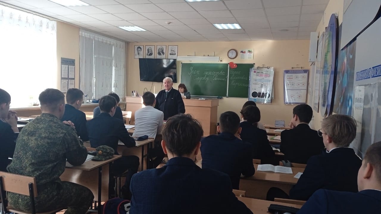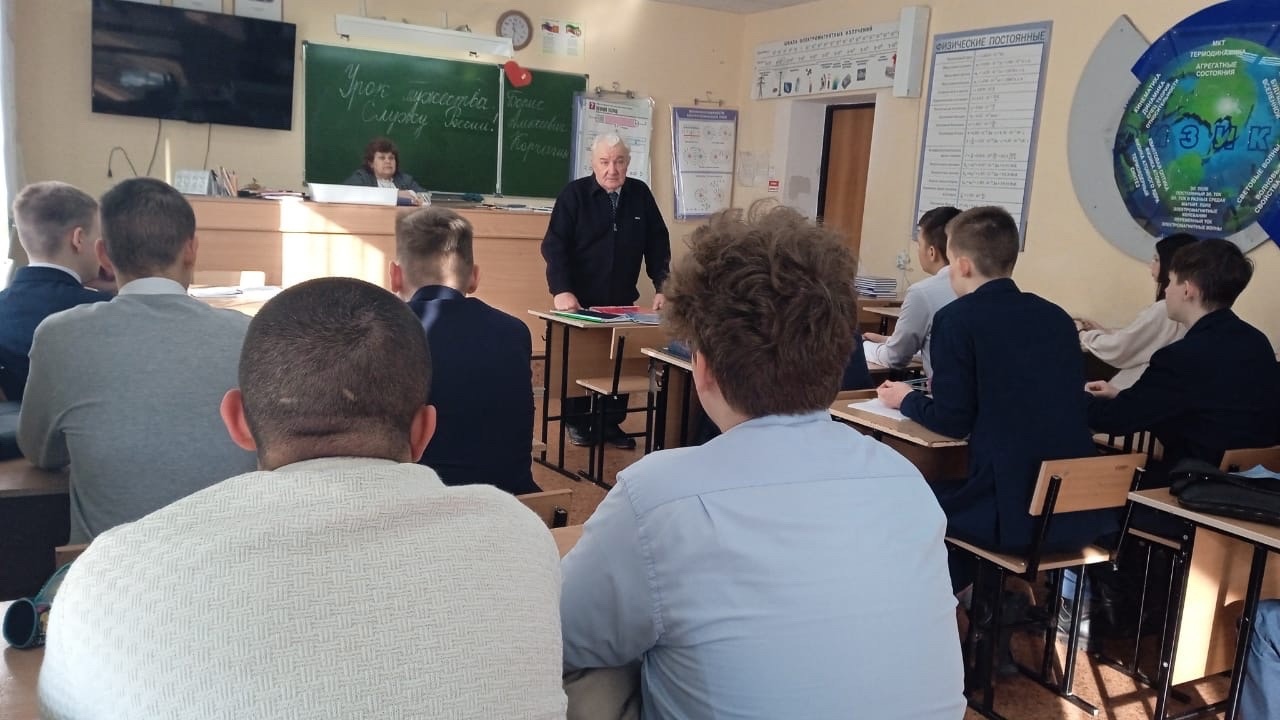 Опубликовано: 14.02.2024Ветеран нашего техникума - Корчагин Борис Алексеевич провёл урок мужества для студентов группы 180 Э (классный руководитель Газизянова Лилия Ирековна)