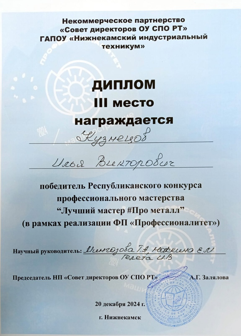 Опубликовано: 26.12.2024Студент нашего учебного заведения, Кузнецов Илья, завоевал диплом третьей степени на Республиканском конкурсе профессионального мастерства "Лучший мастер #Про металл". Этот конкурс проходит в рамках программы "Профессионалитет".