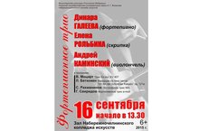 16-го сентября в большом зале Набережночелнинского колледжа искусств состоялся концерт камерного трио, в состав которого вошли педагоги Казанской государственной консерватории (Динара Галеева (фортепиано), Елена Рольбина (скрипка), Андрей Каминский (виолончель).