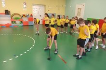 Сегодня на занятии по физической культуре, воспитанники детского сада №129 "Белоснежка", после беседы о зимних видах спорта, тренировались в ведении шайбы и забивании шайбы в ворота одним ударом.