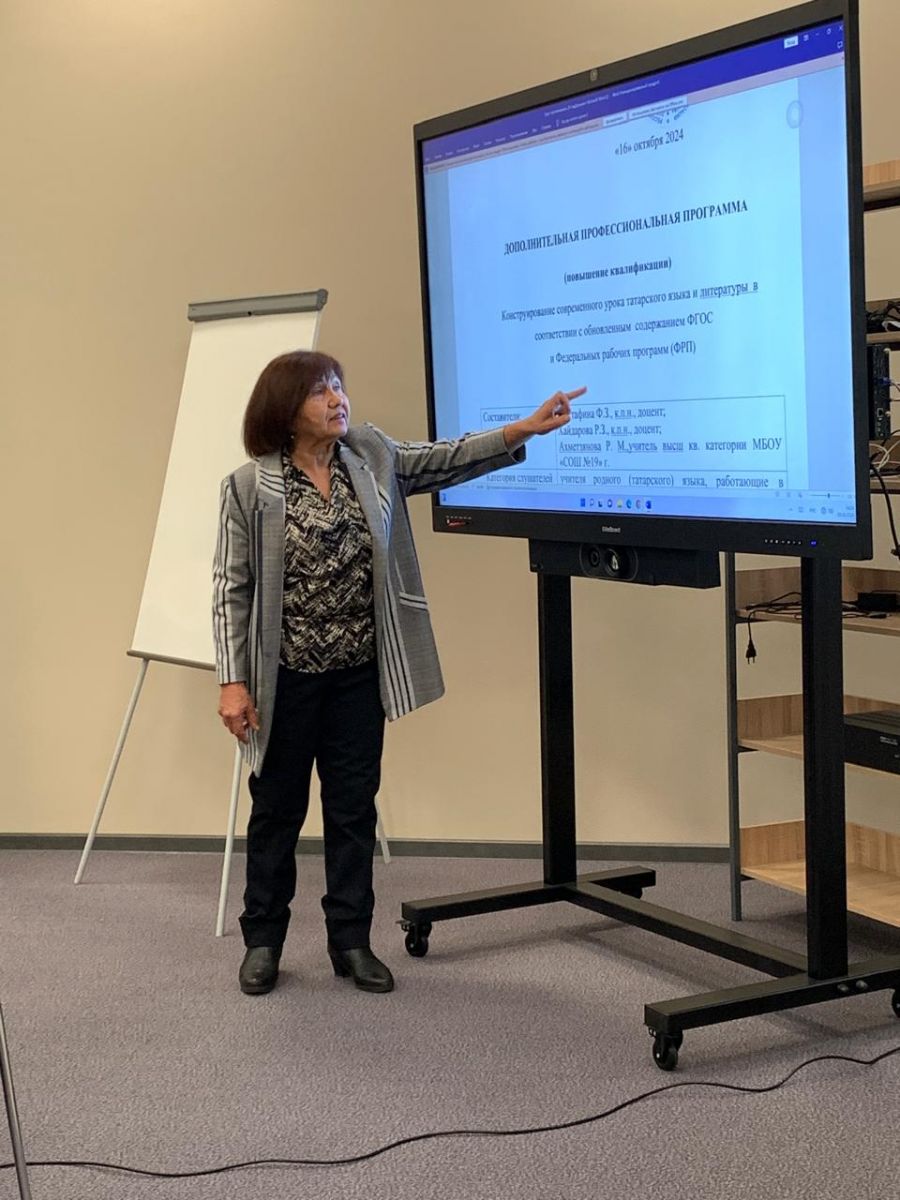 9 нчы октябрьдә, чәршәмбе көнне, "Белем бирү нәтиҗәләренә ирешү буенча дәреснең структур этапларына ФГОС таләпләре» дип аталган семинар булды. "Күңелле татар теле" дэреслек авторы Хәйдәрова Роза Зәкиевна укытучыларнын сорауларына җавап бирде.