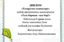 "Татарстан хәзинәләре" шәһәр прогарммасы кысаларындв "Укытучылар һәм остазлар елы" уңаеннан "Остазыма баш иям!" бәйгесендә 1 нче урын алган 5А сыйныфы җитәкчесе Хаметгатина Алсу Мәүлемҗан кызын чын күңелдән тәбрик итәбез.