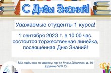 1 сентября 2023 г. в 10:00 час. для студентов 1 курса состоится торжественная линейка, посвящённая Дню Знаний, по адресу: пр-кт Мусы Джалиля, д.10 (Здание УЛК 2).