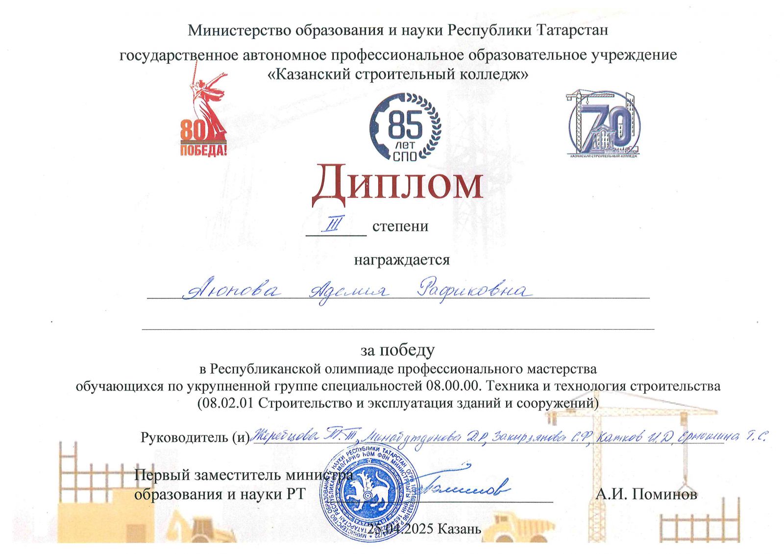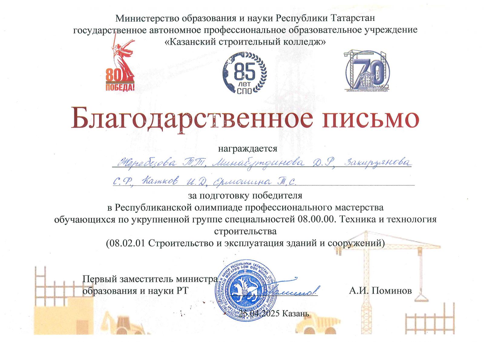 25 апреля 2025 года на базе ГАПОУ «Казанский строительный колледж» состоялась Республиканская олимпиада профессионального мастерства обучающихся по укрепненной группе специальностей 08.00.00 Техника и технология строительства (08.02.01 Строительство и эксплуатация зданий и сооружений).
