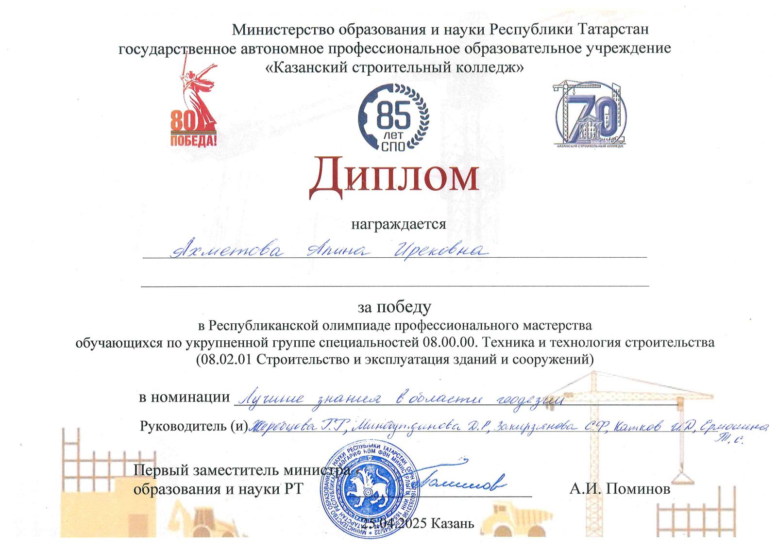 Мы с гордостью сообщаем, что студентки нашего колледжа Аюпова Аделия Рафиковна заняла почётное III место и Ахметова Алина Ирековна победила в номинации «Лучшие знания в области геодезии».