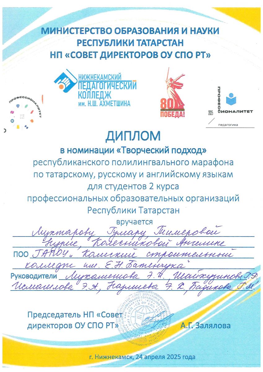 Студенты нашего колледжа Мухтаров Гумар Равилевич, Колесникова Ангелина Валерьевна, группа Сн-3-23, Тимерова Нурия Ильназовна, группа Удн-2-23, под руководством преподавателей Мухаметовой Эльзы Ильгизовны, Шайхузиновой Гузель Рифхатовны, Исмагиловой Эльвиры Альбертовны, Назмиевой Эльмиры Хасангалиевны и Бадиковой Гульнары Мухаррамовны стали победителями марафона в номинации «Творческий подход».