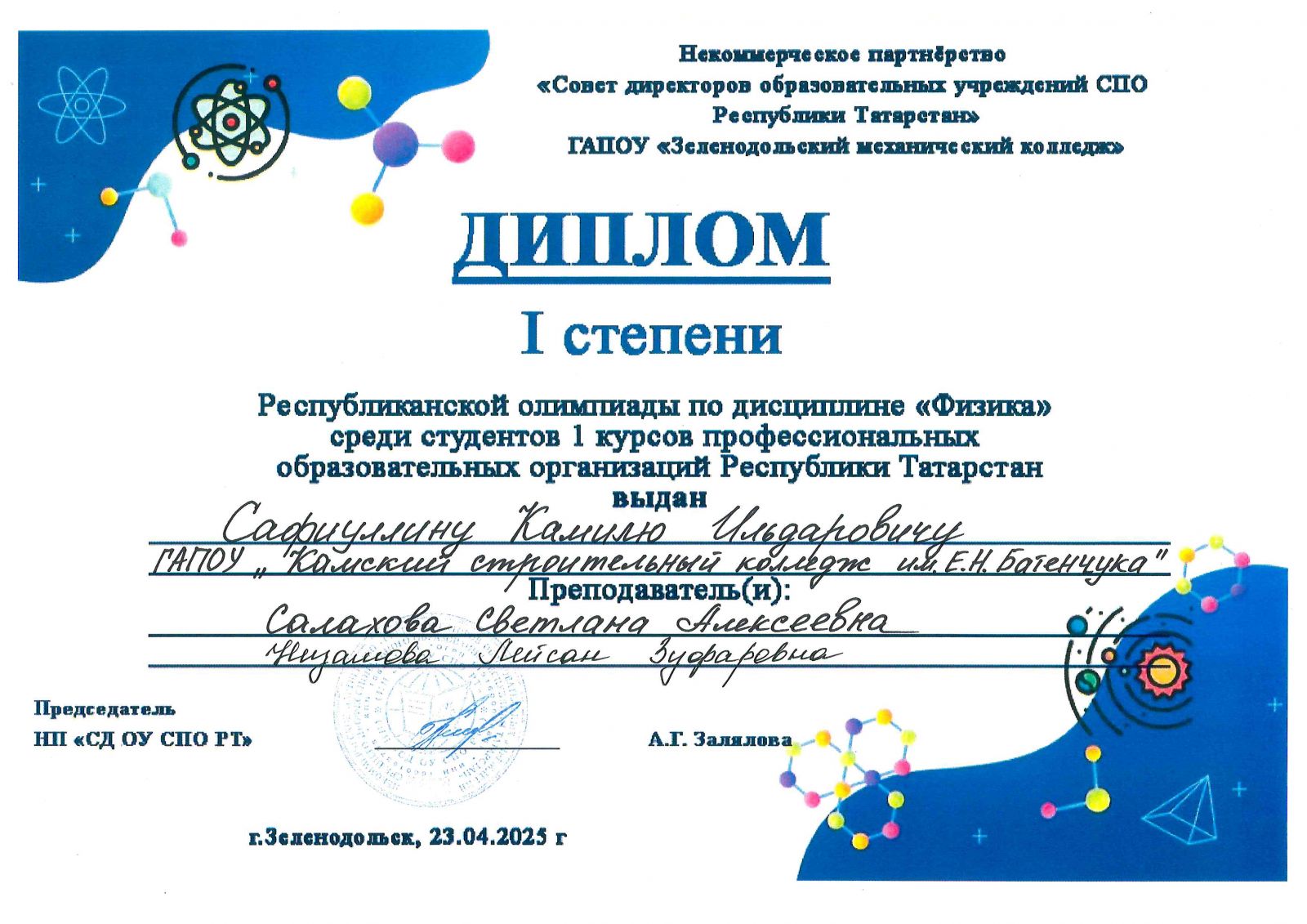 Студент нашего колледжа Сафиуллин Камиль Ильдарович, группа Сн-1-24, под руководством преподавателей Салаховой Светланы Алексеевны и Низамовой Лейсан Зуфаровны стал победителе олимпиады!